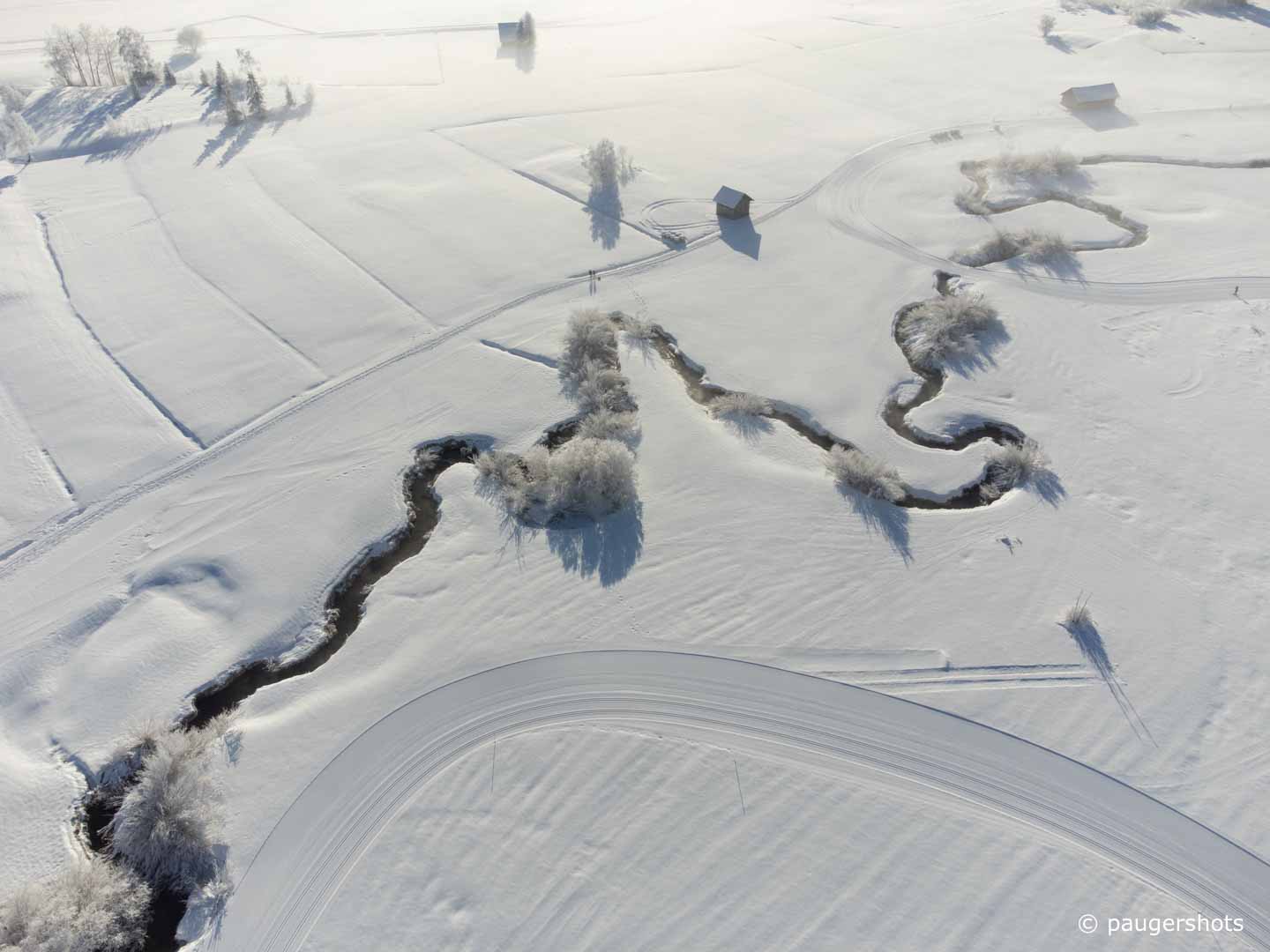 Fluss im Schneefeld